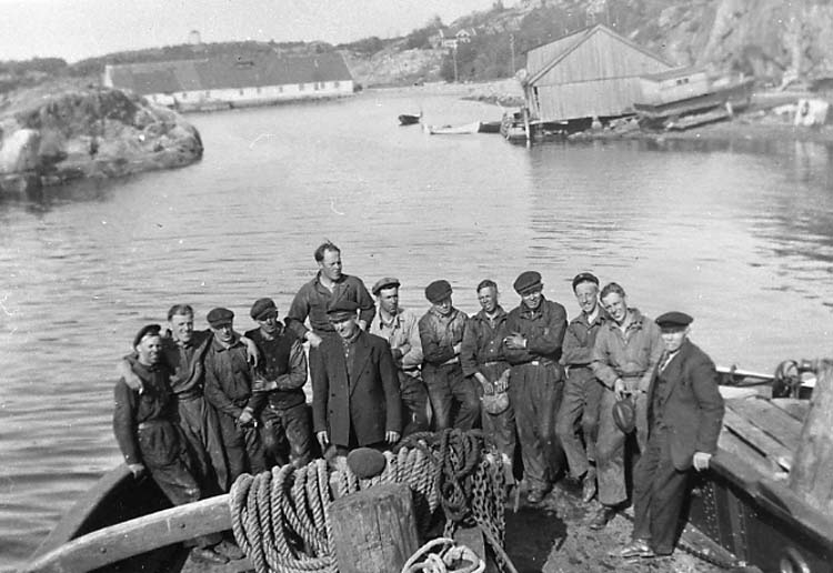 Medföljande text: "Arbetare vid Myrens Mekaniska Verkstad, Strömstad. Fr v Erik Antonsson, Erik Ljungqvist, Axel Winter, Arvid Jansson, Anders Andersson, Erik Nilsson, Anders Winter, Arne Antonsson, Bertil Forsberg, Frank Olsson, Allan Ljungqvist och okänd. Längst fram, mitt i bilden, skepparen på båten, Karl Hansson. Vid verkstaden byttes motor och däck på båten (bogserbåt). Längst bak i bild syns ett gammalt sillsalteri. Till höger i bild ligger Strömstads Lerkärlsfabrik (vid den tiden ej i drift). Bild tagen 1938. Originalfoto tillhörande Allan Ljungqvist, Strömstad".