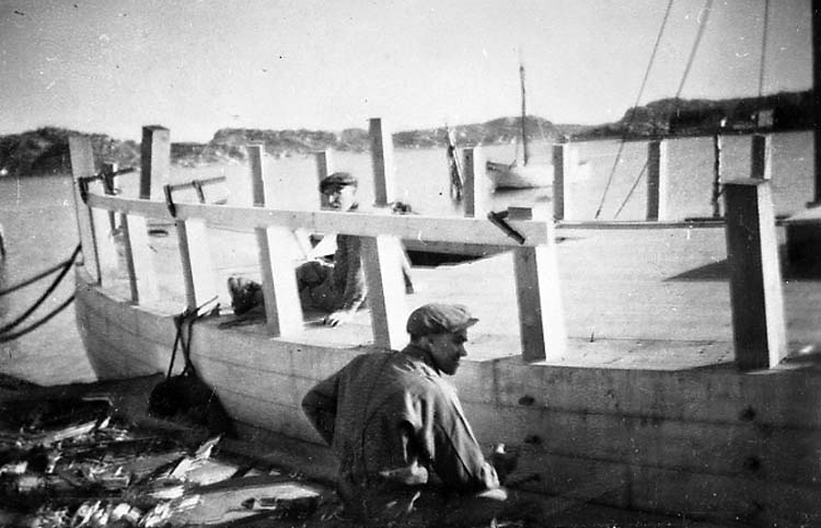 Medföljande text: "Carl och Gustav Olssons varv i Bovallstrand. Första fiskebåten (49 fot) som byggdes vid varvet. (se även 62:2). På bilden syns Gustav Olsson (närmast i bild) och Mauritz Mattsson. Bilden tagen år 1952.