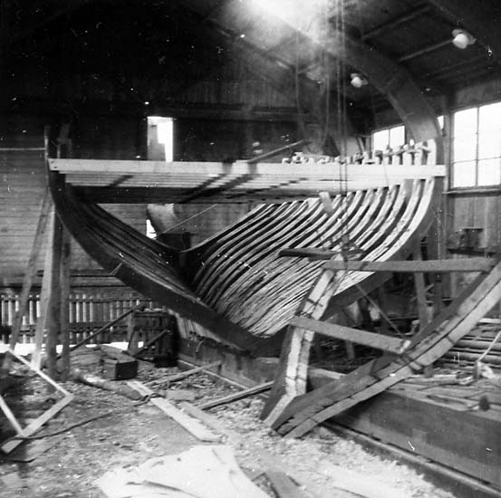 Medföljande text: "Ringens Båtvarv, Marstrand. Byggnation av fiskebåt (förmodligen Randi, byggd 1965, såld till Fotö). Spantningen påbörjad.