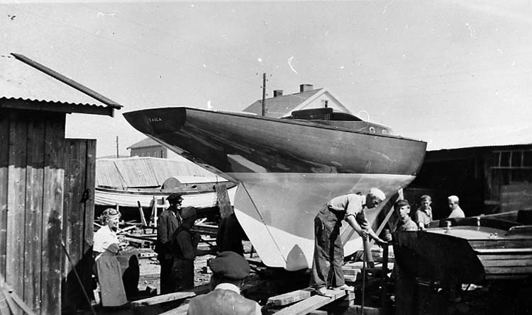 På bilden syns Hans Hansson, varvets första ägare (2:e från vänster), Harry Andersson och Albert Andersson (4:de och 3:de från höger, båda anställda vid varvet; övriga personer på bilden är okända. Bilden tagen vid sjösättningen 1946.