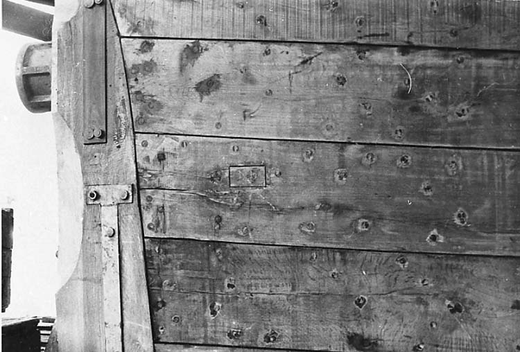 Medföljande text: "Byggnation av fiskebåt (förmodligen Randi byggd år 1965, såld till Fotö) vid Ringens Båtvarv i Marstrand. Detaljbild på järn i akterstäven. Överst till vänster syns hylsan till propellern. Originalfoto tillhörande Jean Dahlström, Marstrand. Se även R. 77:1, R.78:3, R.78:4, R.79:4, R.80:2, R.80:3, R.80:2, R.81:1, R.81:2, R.81:3, R.81:4, R.82:1, R.82:2, R.92:1, R.92:2, R.92:3, R.92:4, R.93.1, R.93:2, R.93:3, R.93:4".