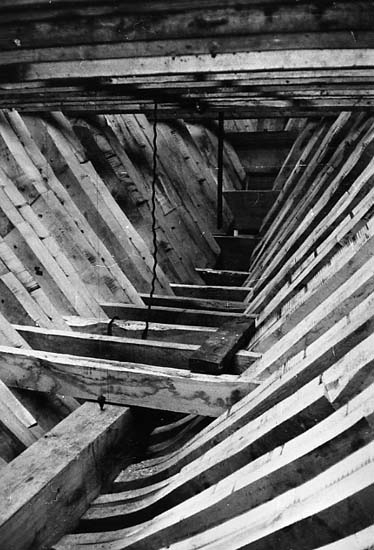 Medföljande text: "Byggnation av fiskebåt (förmodligen Randi byggd år 1965, såld till Fotö) vid Ringens Båtvarv i Marstrand. Detaljbild kölsvinet och bottenstockar. Bilden tagen i riktning mot fören. Originalfoto tillhörande Jean Dahlström, Marstrand. Se även R. 77:1, R.78:3, R.78:4, R.79:4, R.80:1, R.80:2 R.80:3, R.80:4, R.81:1, R.81:2, R.81:3, R.81:4, R.82:2, R.92:1, R.92:2, R.92:3, R.92:4, R.93.1, R.93:2, R.93:3, R.93:4".