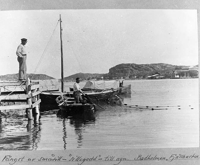 Medföljande text: "Bilden tagen vid Badholmen, Fjällbacka. Fångst av småsill - "sillegudd" till agn. På bilden syns Vilhelm Rickardsson och Robert Åkerström. Bilden tagen 1938, fotograf Sverker Stubelius. Originalfoto tillhörande Kville Hembygdsarkiv, Fjällbacka".