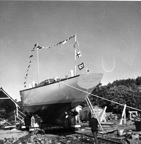Medföljande text: "Best Luck (19,5 m, 34 ton) vid Bröderna Jacobssons Båtbyggeri Källviken, Dragsmark. Bilden tagen 1968. Originalfoto tillhörande Nils Jacobsson, Källviken. Se även R.87:1, R.87:2, R.88:3".