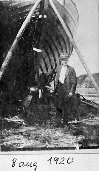 Medföljande text: "Bild från Karl Stjerns varv på Galtö. På bilden syns en montör, Axelsson, från Säffle, som arbetade som motorinstallatör vid varvet. Bilden tagen 1920. Originalfoto tillhörande Tyra Grahn, Galtö".