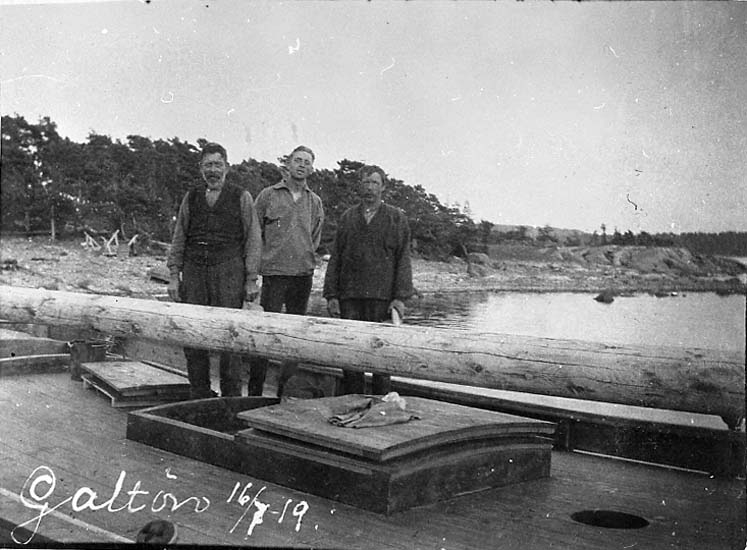 Medföljande text: "På bilden syns fr v Karl Stjern, sonen Oswald Stjern och Otto Alexandersson (båtbyggare). Bilden tagen år 1919 vid Karl Stjerns varv på Galtö, Båten på bilden byggdes till Hilmer Gustavsson från Råssö (se även R.89:1). Originalfoto tillhörande Tyra Grahn, Galtö".