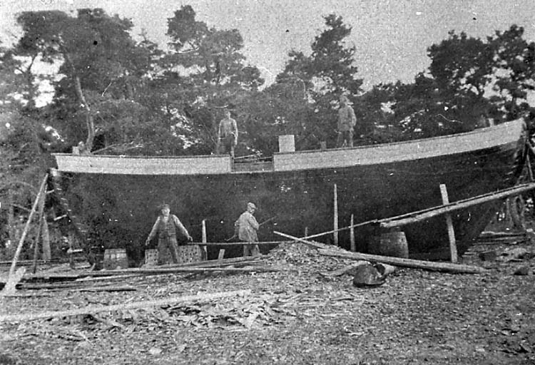 Medföljande text: "Fraktbåt (förmodligen såld till Hunnebostrand) under byggnation vid Karl Stjerns varv på Galtö. Längst till vänster syns Karl Stjern. Bilden tagen 1920. Originalfoto tillhörande Tyra Grahn, Galtö".