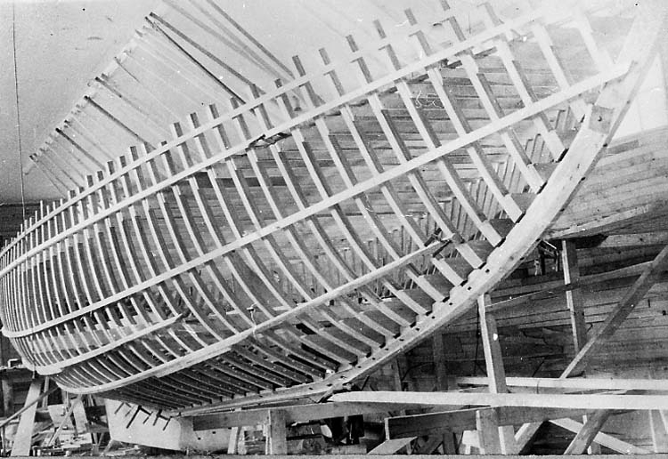 Medföljande text: "Segelbåten Best Luck (1 19,5 m; 34 ton) (se R.87:1, R.87:2, R.88:3) under byggnad vid Bröderna Jacobssons Båtbyggeri i Källviken, Dragsmark. Spanten resta. Bilden tagen 1967-1968. Originalfoto tillhörande Nils Jacobsson, Källviken. Se även R.90:1, R.91:2, R.91:3".