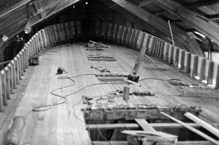 Medföljande text: "Byggnation av fiskebåt (förmodligen Randi byggd år 1965, såld till Fotö) vid Ringens Båtvarv i Marstrand. Däcket lagt. Bilden tagen från aktern sett. Originalfoto tillhörande Jean Dahlström, Marstrand. Se även R. 77:1, R.78:3, R.78:4, R.79:4, R.80:1, R.80:2 R.80:3, R.80:4, R.81:1, R.81:2, R.81:3, R.81:4, R.82:1, R.82:2, R.92:1, R.92:2, R.92:4, R.93.1, R.93:2, R.93:3, R.93:4".