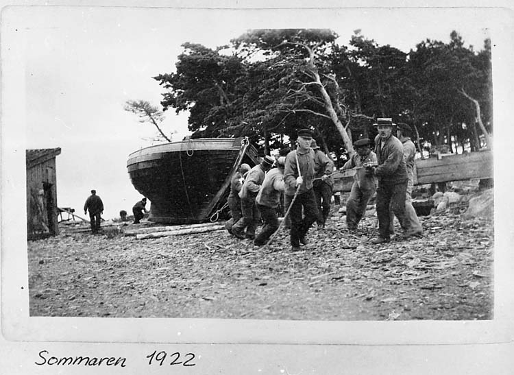 Medföljande text: "Bild från Karl Stjerns varv på Galtö. På bilden syns upptag av båt. Bilden tagen år 1922. Originalfoto tillhörande Tyra Grahn, Galtö".