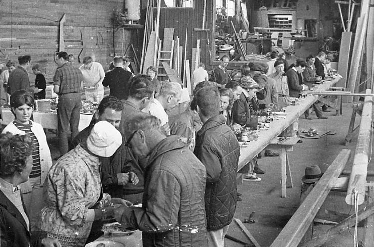 Medföljande text: "Sjösättningsfest efter sjösättning av segelbåten "Best Luck" i båtbyggarverkstaden vid Bröderna Jacobssons Båtbyggeri, Källviken, Dragsmark. "Bordet" i mitten av bilden är Best Lucks stormast. Bilden tagen i juli 1968. Originalfoto tillhörande Nils Jacobsson, Källviken. Se även R.87:1 och R.87:2".