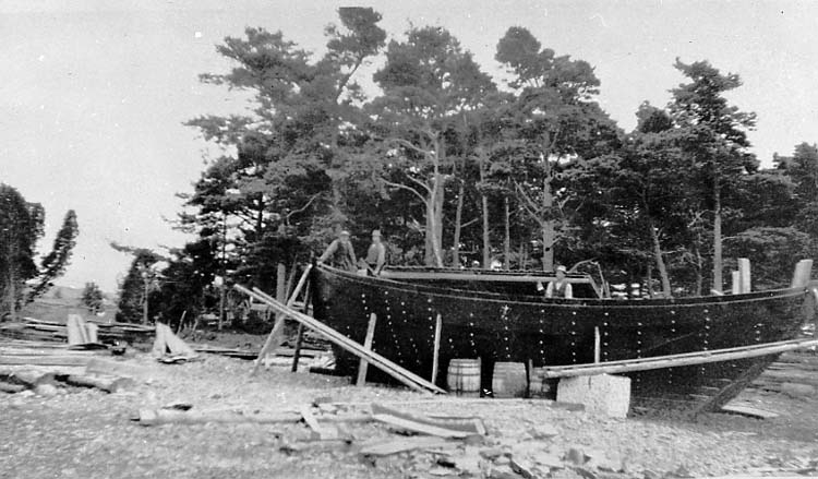 Medföljande text: "Båt under byggnad vid Karl Stjerns varv på Galtö. Båten beställdes av Oskar Hansson, Kungsbäck (nära Hogdal). Bilden tagen sommaren 1928. Originalfoto tillhörande Tyra Grahn, Galtö".