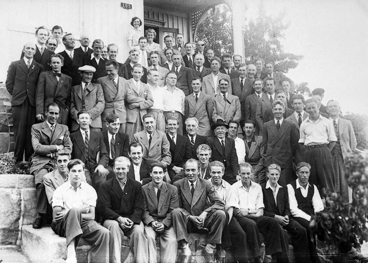 Medföljande text: "Fotografi taget i anledning av J W Bergs 60-årsdag 1945 på trappan utanför hans hus. 1. Lennart Berg, yngste son till J W Berg, 2. Elon Johansson, 3. Johansson (Nordensjö), bror till 33:s fru, 4. Östen Berg, son till J W Berg, 5. Åke Johansson (Wallsten), bror till 3, 6. Bertil Kristiansson, svetsare, ordf. i fackf. 7. Valter Berg, son till J W Berg, 8. Ingmar Kristiansson, 9. Agne Hilmersson, svarvare, 10. Karl Lennart Karlsson, montör, 11. Folke Olofsson, svetsare, kusin till 33, 12. Harry Skog, Borlänge (ej på Bergs, gift med J W Bergs dotter), 13. Hjalmar Hermansson, timmerman, kom från Tjörn, 14. Adolf Andersson, timmerman, 15. Johan Wiktor Berg, direktör, 16. Sven Pettersson, svetsare, 17. Josef Olsson, drivare, 18. Oskar Olofsson, timmerman, 19. Bertil Gustavsson, svarvare, 20. Okänd, 21. Sven Olsson, drivare; son till 17, 22. Manfred Andersson, 23. montör, 24. Okänd, 25. John Svensson, 26. Oskar Jansson, 27. Mauritz Johansson, timmerman, 28. Arvid Olsson "Drivar-Arvid", drivare, 29. Sven Olsson, 30. Okänd, 31. Allan Alhberg, timmerman, 32. Okänd, 33. Erlend Andreasson, montör, 34. Oskar Karlsson, sågare, 35. Lindberg, fru till 44, 36. Harry Andersson, timmerman, flyttade till Småland, 37. äldsta dotter till J W Berg, gift med 12, 38. Henning Eriksson, gjutare, 39. Folke Karlsson, snickare, 40. Karl "Sme-Kalle" Gustavsson, smed, 41. Eisten Sjödell, snickare, 42. Fredrik Klar, timmerman, 43. Sigvard Olofsson, montör (propellrar), 44. Lindberg, bokhållare, 45. Almén, svarvare, 46. Alfred Olsson, snickare, 47. Johan Sundberg, svarvare, 48. Albin Ahlberg, montör, 49. Karl Hilmersson, målare, 50. Martin Johansson, timmerman, 51. Algot Pettersson, körde timmerbåten, 52. Torsten Almqvist, montör, 53. Adel Svenningsson, montör, farbror till 67, 54. Harry Karlsson, timmerman, 55. Albert Johansson, kom från Bleket, Tjörn, kallad Blearn, 56. Okänd, 57. Johan Olsson, sågare, (skötte ramsågen), 58. Verner Almqvist, 59. Reinold Olsson, 60. Karlsson (Solbräcke), kom från Eriksberg våren 1945, 61. Karl "Nilsson" Gustavsson, plåtslagare, 62. Hjalmar Ahlqvist, 63. Torsten Österberg, 64. Olle Berg, svarvare, sedan kontoret, brorson till J W Berg, 65. Okänd, 66. Okänd, 67. Oskar Svenningsson, timmerman, kom från Knippla, förman på Björkö. Ägare till bilden: Östen Berg, Hälsö. Uppgiftslämnare: Östen Berg och Erland Andreasson, Hälsö.