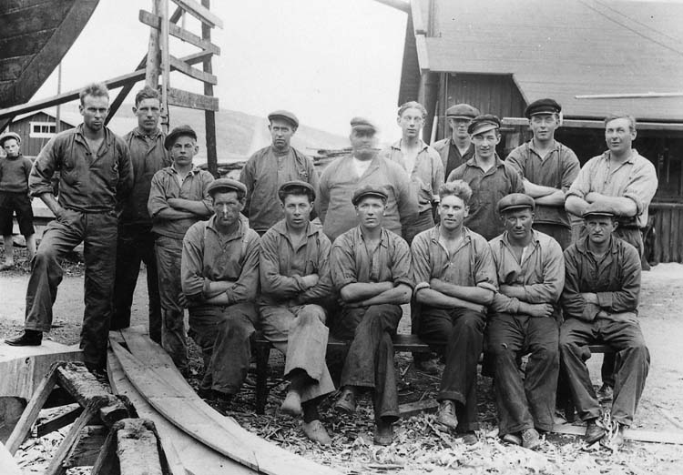 Medföljande text: "Personalen på Petter Petterssons varv i slutet av 1920-talet. 1. Gunnar Hansson, 2. Hjalmar Johansson, 3. Karl Johansson, 4. Martin Johansson, 5. Olof Johansson, 6. Karl, 7. Daniel Jansson, 8. Assmund, 9. Johan, 10. Sven Karlsson, 11. Valfrid Johansson, 12. Petter Pettersson, 13. Per Andersson, 14. Ivar Johansson, 15, "lånegubbe", 16. Arvid, 17. Julius Karlsson. Ägare till bilden och uppgiftslämnare: Julius Karlsson, Hälsö".