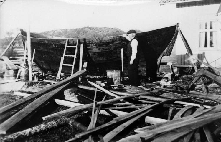 Medföljande text: "Karl August Hansson ("Smekarl" kallad) 1870-1953, känd båtbyggare på Koster. Karl Hansson byggde 30-40 båtar, den sista båten byggdes i slutet av 1940-talet. Här utanför bostaden på Kilen, Sydkoster. Bilden tagen på 1940-talet. Originalfoto från Göran Larsson, Koster".