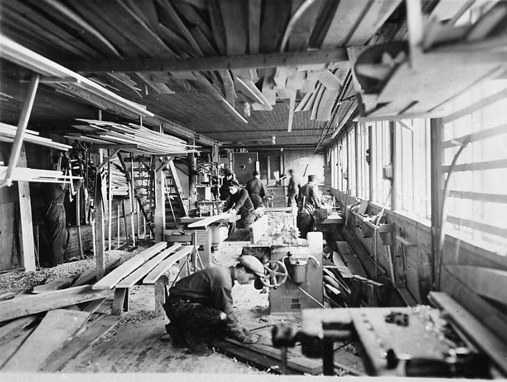 Medföljande text: "Myrens Mekaniska Verkstad, Strömstad. Tillverkning av livbåtar på 1940-talet. Originalfoto från Sven Baatz, Strömstad".
