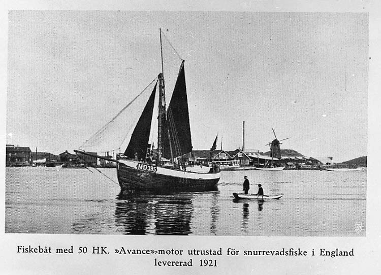 Text på kortet: "Fiskebåt med 50 HK. "Avance" motor utrustad för snurrevadsfiske i England levererad 1921".