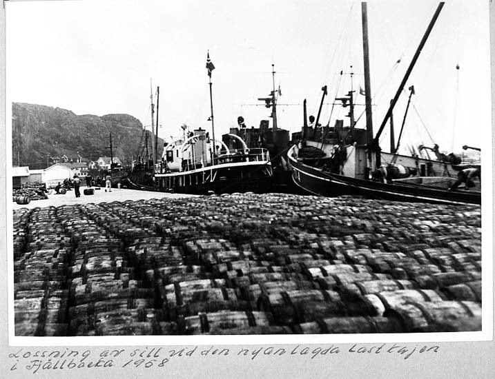 Medföljande text: "Lossning av sill vid den nyanlagda lastkajen i Fjällbacka 1958".
