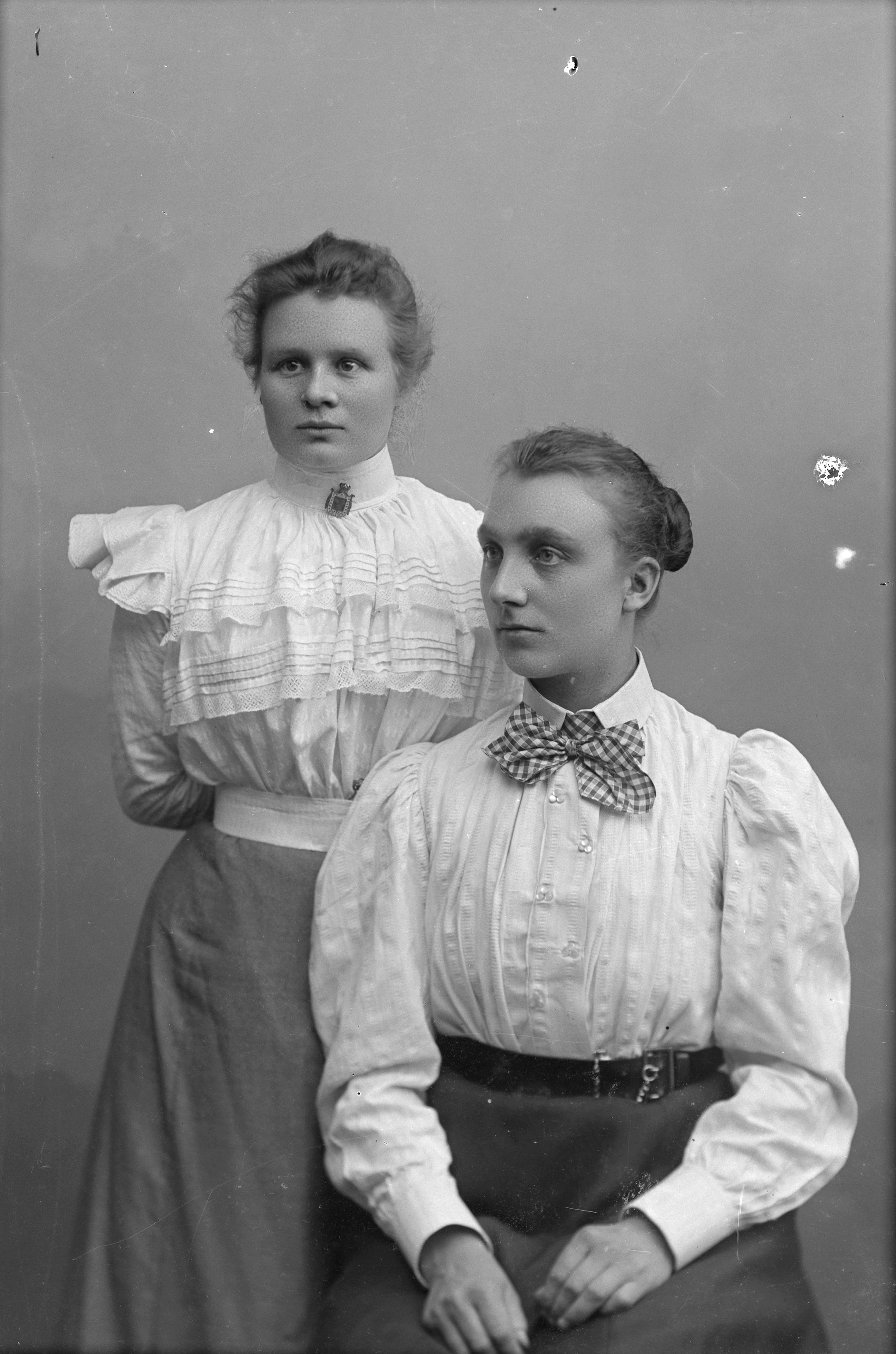 Beskrivning: Porträtt i helfigur av pigan Anna Jönsson Herlin med okänd kvinna. Anna Herlin sittande.