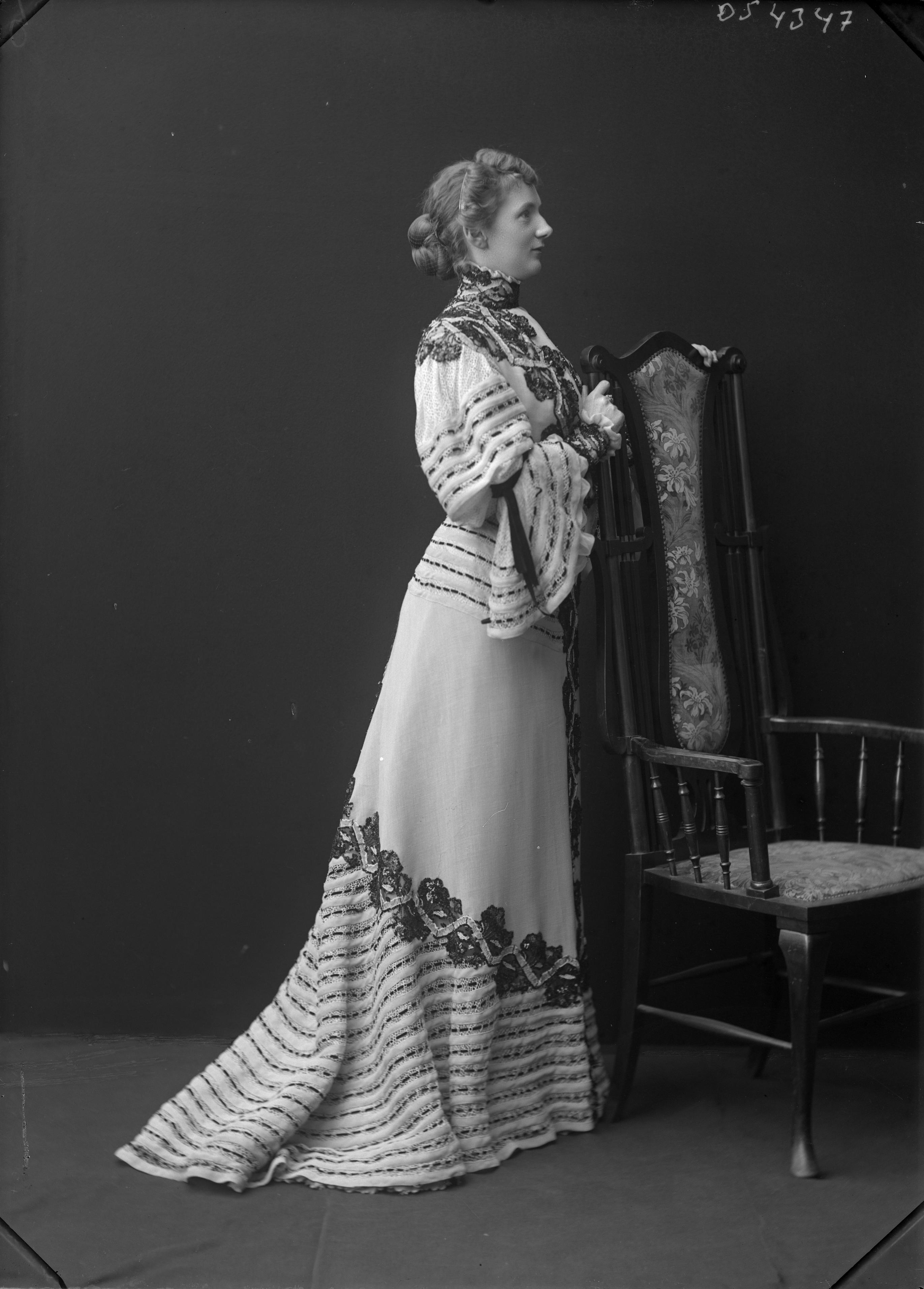 Porträtt i helfigur av Marie Sofie Dingertz, stående vid stol.