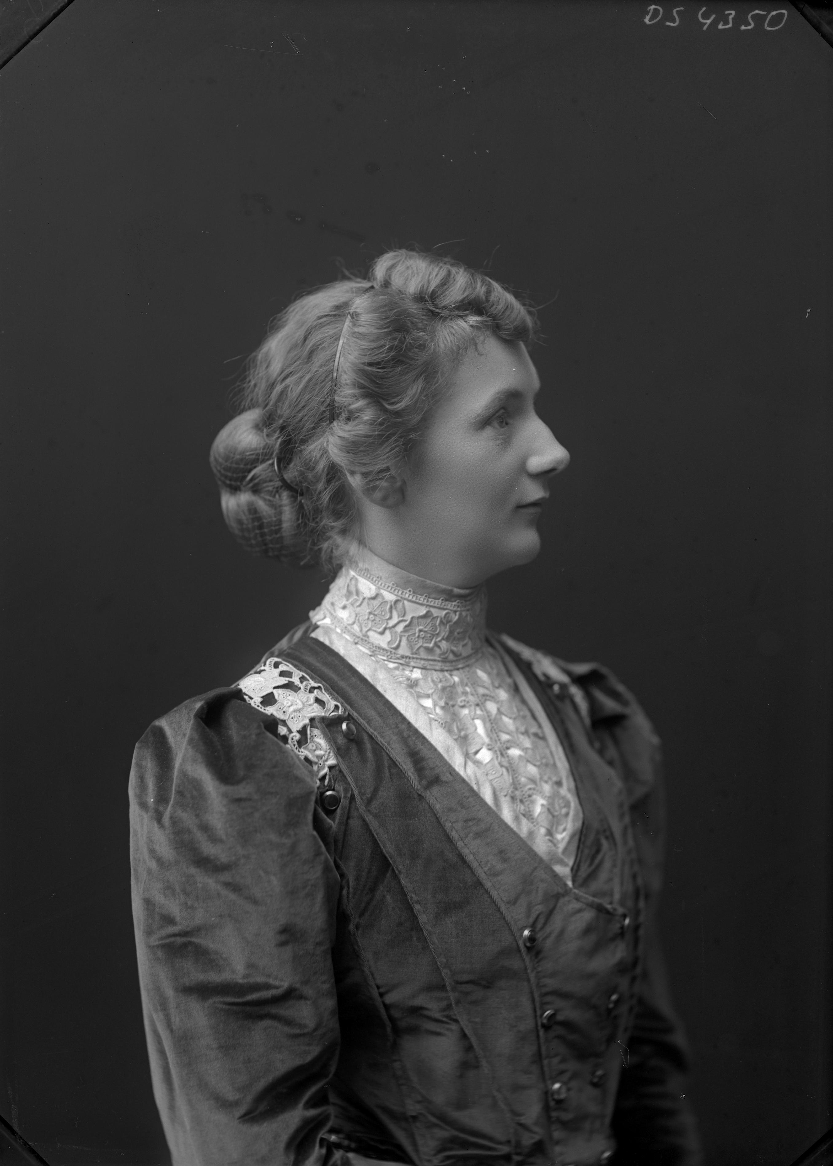 Porträtt i halvfigur av Marie Sofie Dingertz, ansikte i profil.