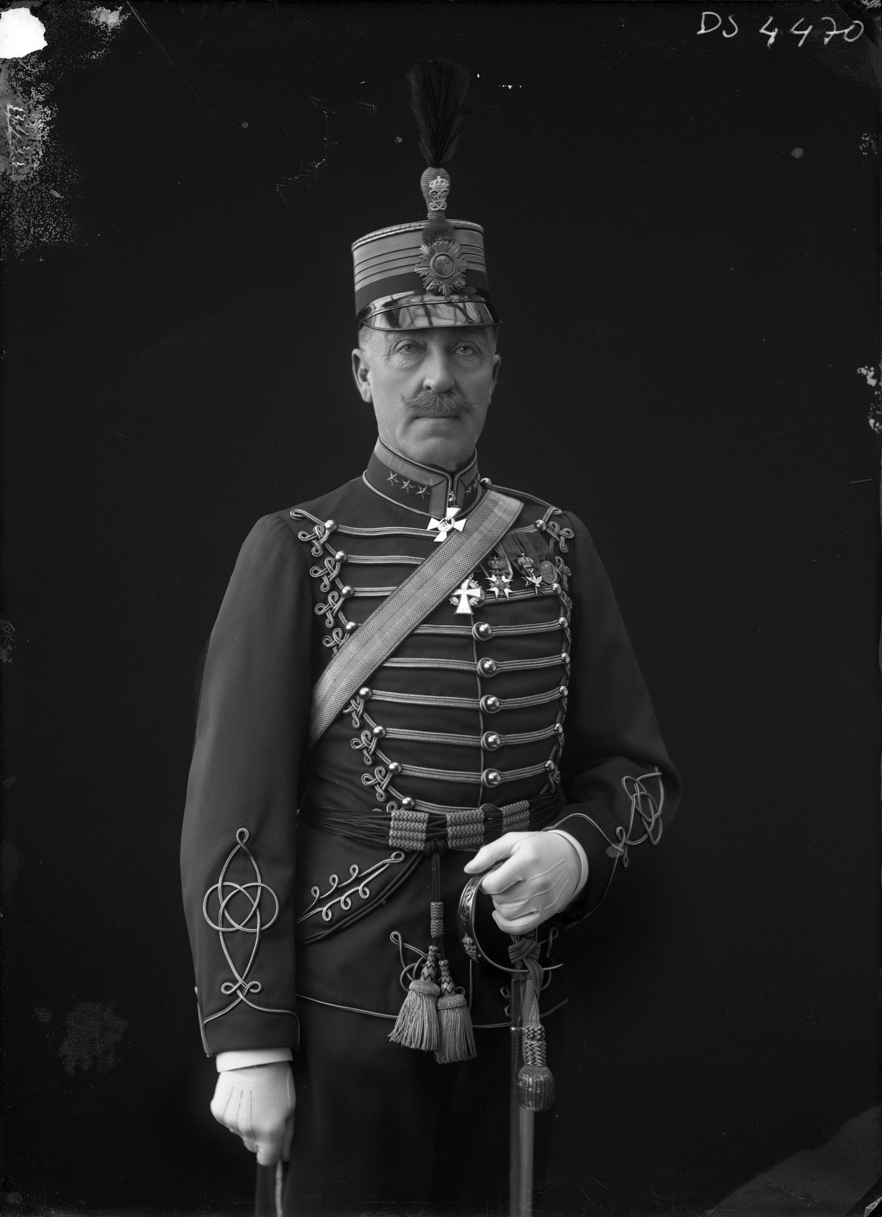 Porträtt i helfigur av överste Bror Munck af Fulkila i militäruniform och -mössa.