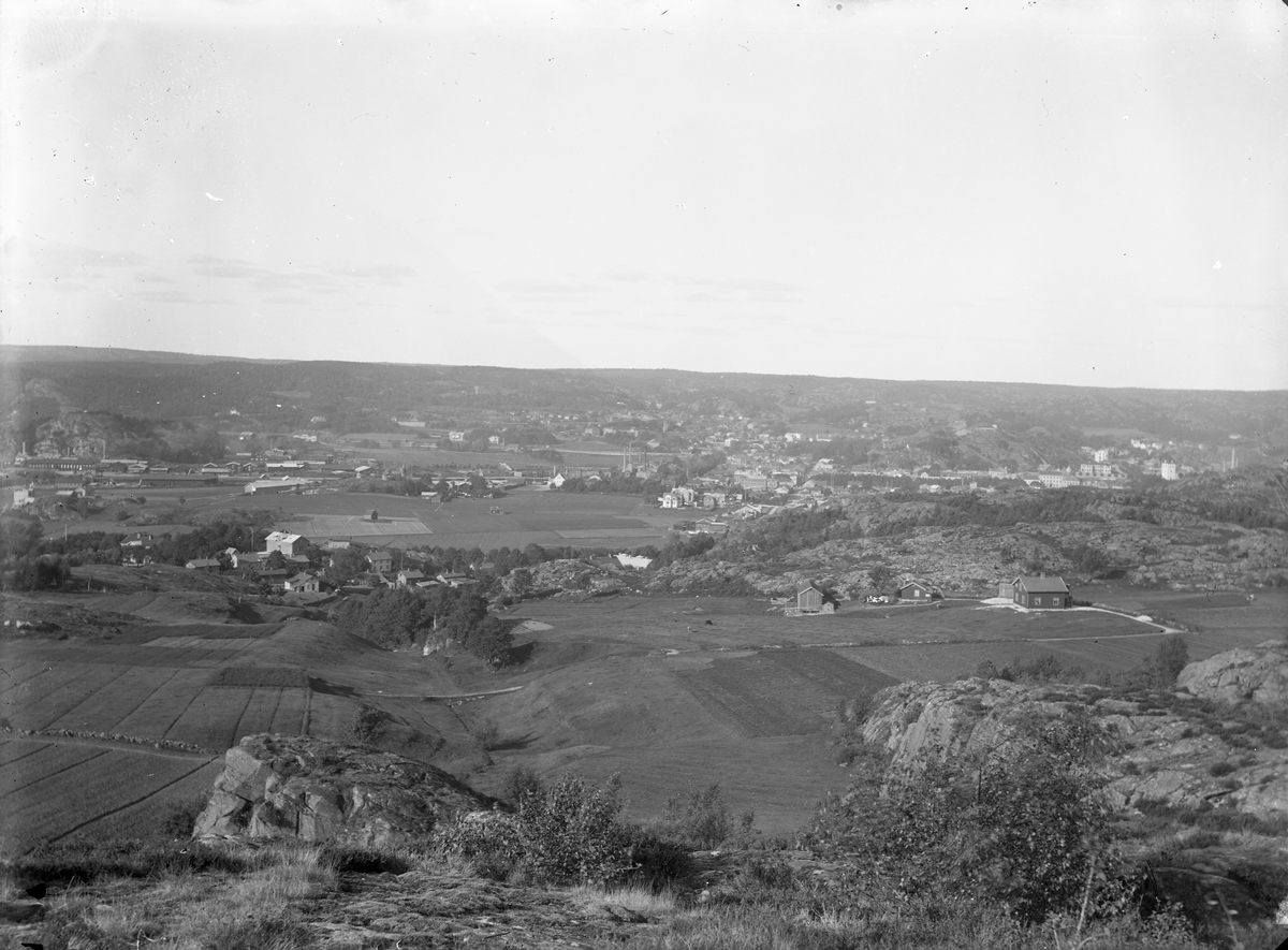 En landskapsbild över åkrar och tät bebyggelse, tidigt 1900-tal.