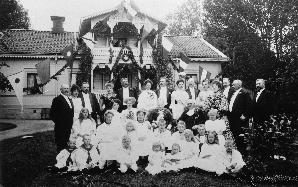 Bild från lantstället "Lyckan". Ursprungligen tillhörande grosshandlare Victor Th. Engwall m. fam. Fotografiet taget vid Victor Th. Engwalls och hans fru Christina, f. Norberg, guldbröllop 1904 och upptar den dåvarande familjekretsen.