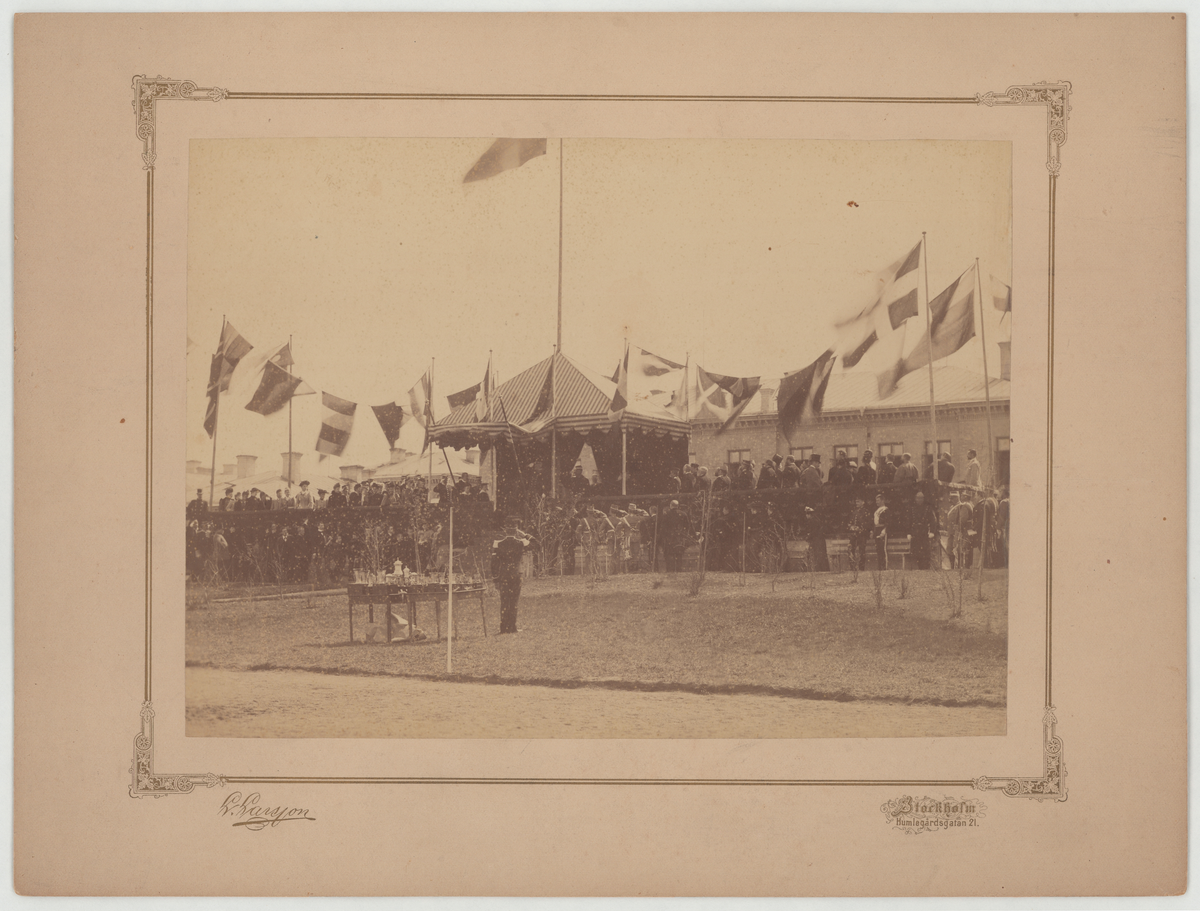 Gymnastikfest 1891. Man gör honnör vid bord med idrottspriser. Militärer i närheten hedrar kunglig paviljong.