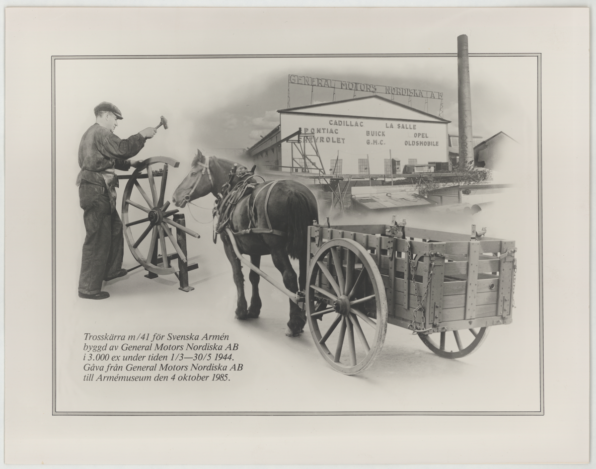 Titel: Trosskärra m/1941 för svenska armén. Byggd av General Motors Nordiska AB. Gåva från GM 1985. Fotomontage.