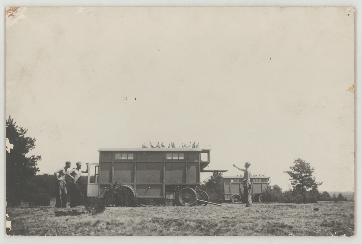 Titel: Beväringar vid två vagnar med brevduvor på taken.