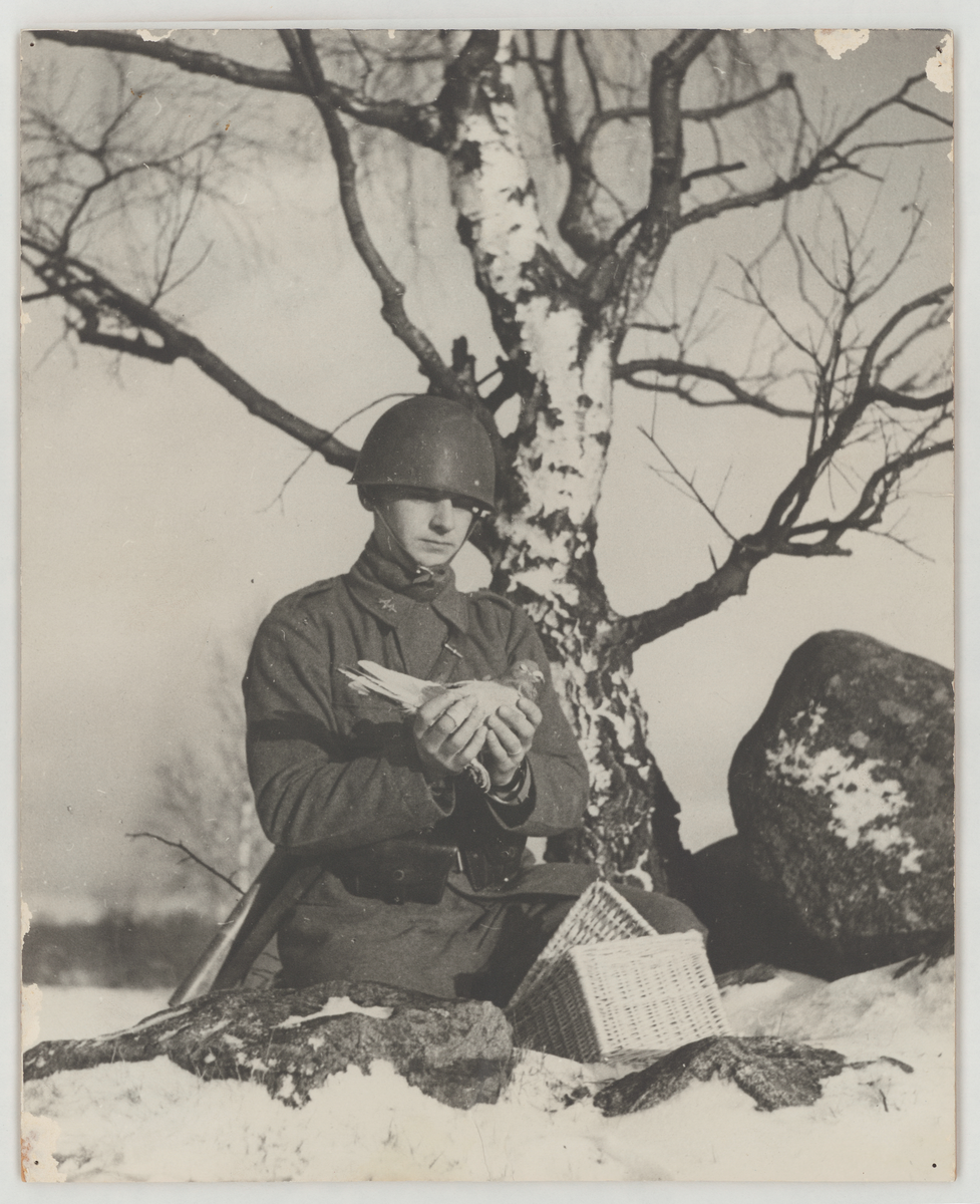 Titel: Soldat ur signaltrupperna håller i en brevduva.