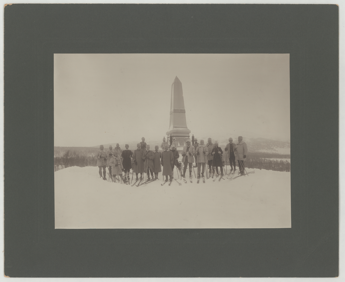 Hälsinge regemente I 14, grupp på skidor poserar vid ett monument.