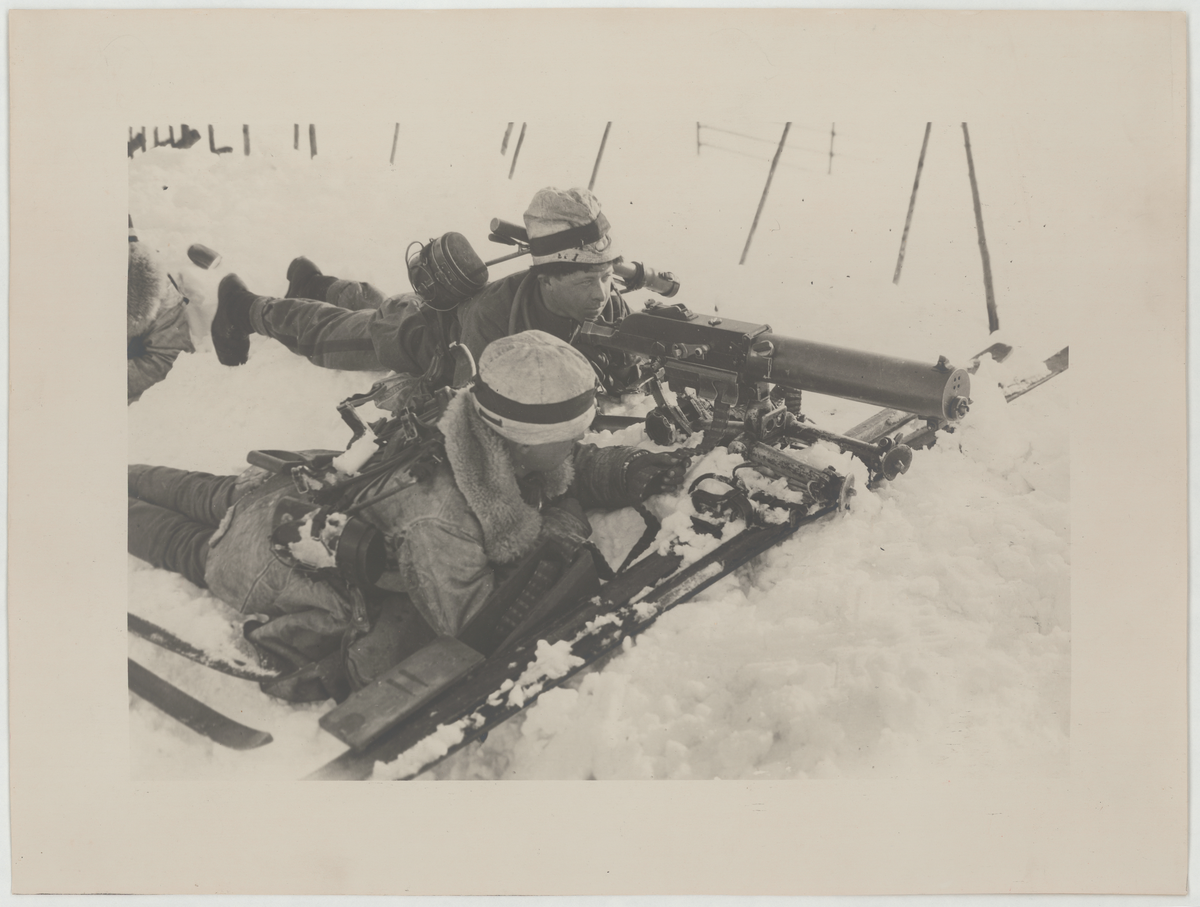 Titel: Två vinterklädda soldater i snön med kulspruta.