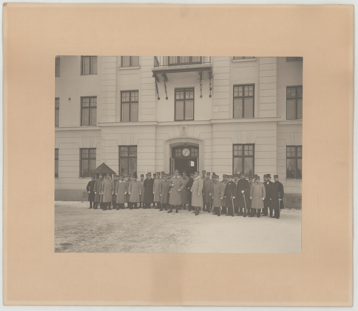 Titel: Hälsinge regemente (I 14). Kung Gustaf V poserar med officerare utanför kanslihuset.