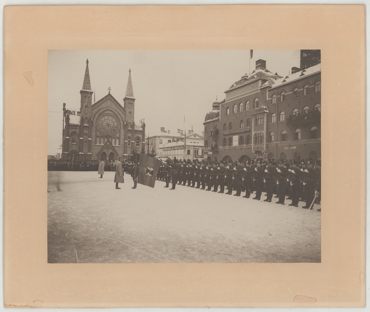 Parad på torg. Kung Gustav V inspekterar regementet.