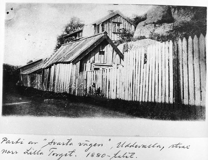 Medföljande text: "Parti av "Svarta vägen". Uddevalla strax norr Lilla Torget. 1880-talet".