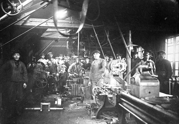 Medföljande text: "Personalen på Bergs varv i verkstan i början på 20-talet. Fotografiet taget vid samma tillfälle som bilden utanför verkstan och personerna är troligen desamma som på den bilden. Remdriften som ses på bilden var kvar till det att verkstan brann ned 1961. Ägare till bilden och uppgiftslämnare: Östen Berg, Hälsö".