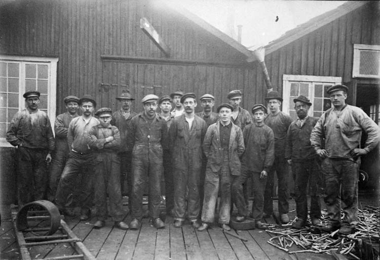Medföljande text: "Fotografi av personalen vid J W Bergs varv taget utanför den 1961 nedbrunna verkstan i början på 20-talet. 1. Johan Wiktor Berg, 2. Fiskare ?, 3. Karl "Nilsson" Gustavsson, plåtslagare, 4. Olle Magnusson, förrådsman, 5. Albin Ahlberg, montör, kom från sjön, 6. John Kristiansson, montör, 7. Karl "Sme-Kalle" Gustavsson, smed, 8. Fiskare ?, 9. Johan Sundberg svarvare, en av Bergs första anställda 1912, 10. Axel Pettersson, montör, 11. John Sjödell, svarvare, emigrera till Amerika 1924, 12. Rickard Almqvist, montör, bror till J W Bergs hustru, 13. Oskar Nilsson, son till 15, 14. Ernst Berg, äldre bror till 1, 15. Niklas Nilsson, timmerman, kom från Orust, 16. Birger Nilsson, timmerman, son till 15. Ägare till bilden och uppgiftslämnare: Östen Berg, Hälsö".