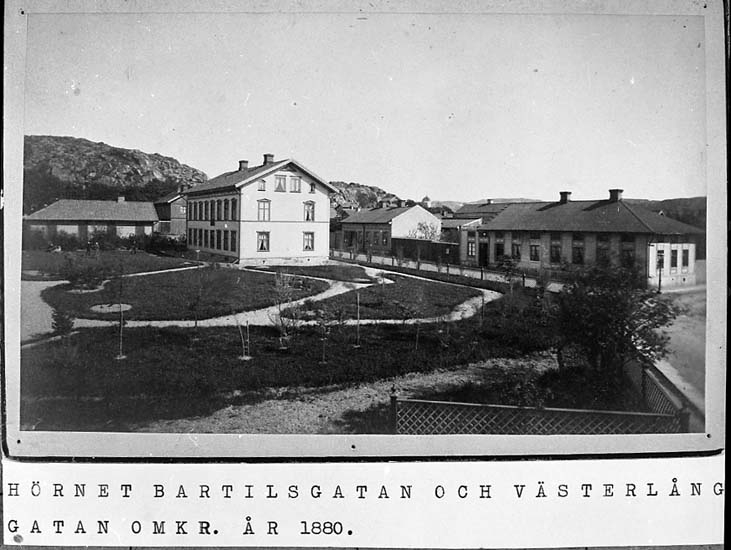 Text på bilden: "Hörnet Bartilsgatan och Västerlånggatan omkr. år 1880".