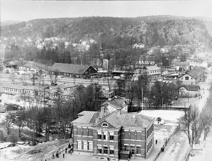 Medföljande text: "Partille sn. Partille folkskola. Vy över centrala Partille från söder 1966. Kulturnämndens arkiv nr 1975 16:2".