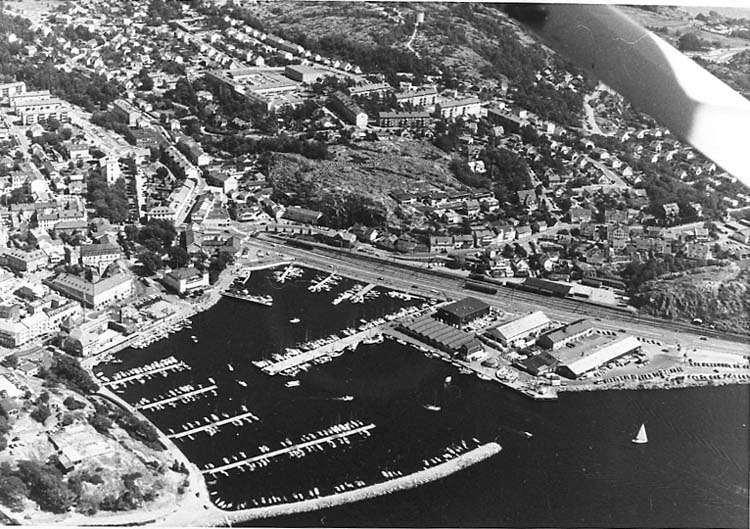 Medföljande text: "Flygfoto: Strömstad södra del, 1970-74. Från V, original B.B.K. Uddevalla".