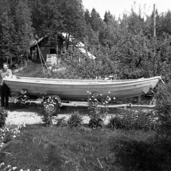 Medföljande text: "Tune-julle byggd av Johan Johansson, Hogdal. I bakgrunden syns Johan Johanssons verkstadsbyggnad. Personen på bilden okänd. Bilden tagen på 1960-talet eller i början av 1970-talet.