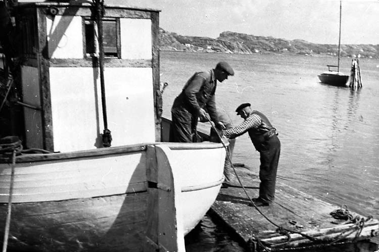 Medföljande text: "Reparation av en fiskebåt (se även R.74:1) vid Carl och Gustav Olssons varv i Bovallstrand. Till vänster Gustav Olsson, till höger skepparen. Bilden tagen 1947-1948. Originalfoto tillhörande Gustav Olsson, Smögen".