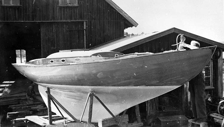 Medföljande text: "Nybyggd vingakryssare vid Stenungsunds Båtvarv, Stenungsund. Bilden tagen vid sjösättningen 1948-49.