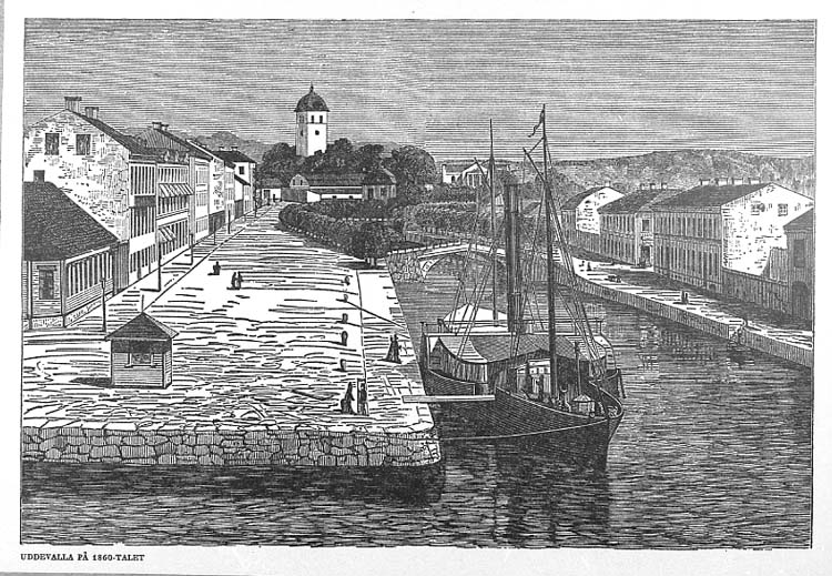Medföljande text: "Teckning med motiv över Bäveåns stränder där två broar förbinda de skilda stadsdelarna. Hamnmotivet dateras omkr. 1860-talet. Uddevalla postkontorhistorik sedan början av 1800-talet".