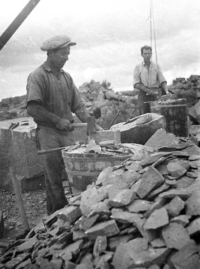 Medföljande text: "Gatstenshuggning i Mörhultsbergen. Foto Sverker Stubelius, år 1937. Simon Karlsson född omkr. 1902. Henrik Johansson-Hammarström född 1892".
