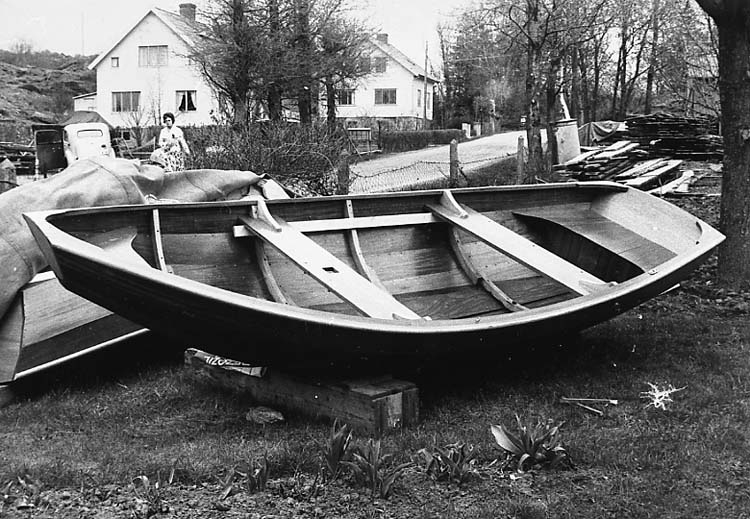 Medföljande text: "Leveransklar bohuseka byggd av Karl Olsson, Ellös. Bilden tagen 1950-1955. Originalfoto tillhörande Karl Olsson, Ellös".
