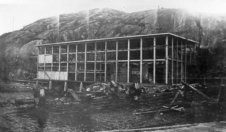Medföljande text: "Myrens Mekaniska Verkstad, Strömstad. Nya snickarverkstaden under byggnad. (Gamla verkstaden syns inbyggd i nya snickarverkstaden. Bilden tagen år 1936. Originalfoto tillhörande Allan Ljungqvist, Strömstad".