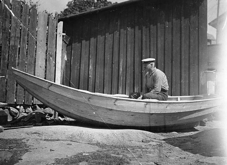 Medföljande text: "Båtbyggare Linus Bengtsson, Hasslösund, i nybyggd eka.